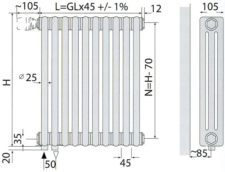 Трубчатые радиаторы ARBONIA строительная длина 45 мм. Секции сварены между собой. Радиатор состоит из верхнего и нижнего коллекторов, которые соединены мжду собой трубками из прецизионной стали диаметром 25 мм*1,5 мм. Радиаторы поставляются подготовленными к монтажу: с двумя присоединительными переходниками (1/2,3/4), с переходником под кран Маевского и заглушкой. Теплоотдача испытана по EN442 и зарегистрирована под Nr.2602E.