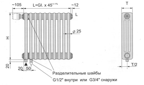 Трубчатые радиаторы ARBONIA строительная длина 45 мм. Секции сварены между собой. Радиатор состоит из верхнего и нижнего коллекторов, которые соединены мжду собой трубками из прецизионной стали диаметром 25 мм*1,5 мм. Радиаторы поставляются подготовленными к монтажу: с двумя присоединительными переходниками (1/2,3/4), с переходником под кран Маевского и заглушкой. Теплоотдача испытана по EN442 и зарегистрирована под Nr.2602E.